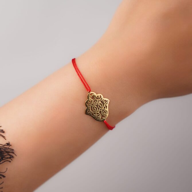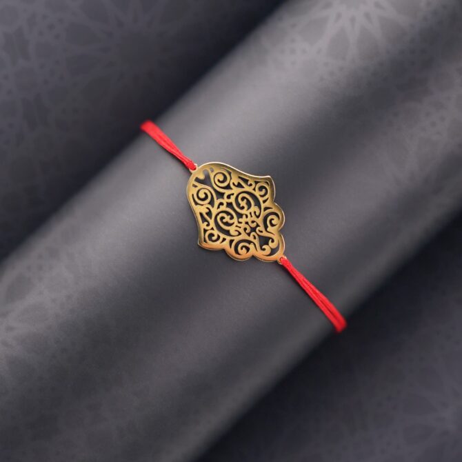 Le Fatna est un cordon rouge ajustable avec une khmissa imposante en acier inoxydable doré, alliant protection et élégance.